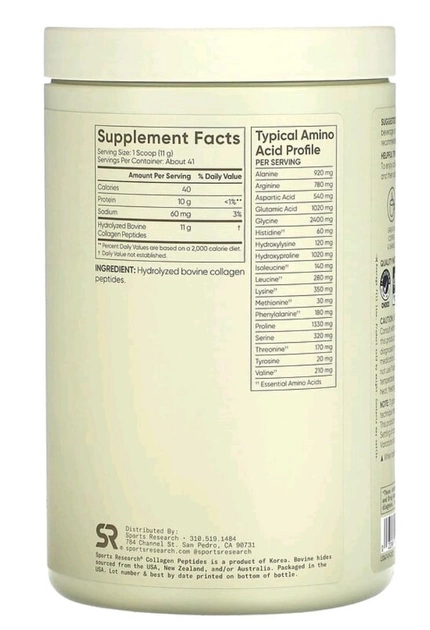 Пептиди колагену Sports Research піддаються гідролізу, тому з’єднуються з вашим улюбленим напоєм і легше засвоюються. Колаген — найпоширеніший білок в організмі людини, але чи знаєте ви, що наш організм виробляє все менше й менше з віком? Це призводить до появи зморшок, болю в суглобах і багато іншого. Достатня кількість колагену забезпечує оптимальне функціонування всього: від шкіри та нігтів до здоров’я суглобів і кісток. Завдяки 11 г пептидів колагену типів I та III в 1 мірній ложці та 18 амінокислотам, гідролізовані пептиди колагену Sports Research є ідеальною підтримкою відновлення під час тренувань, щоб ви могли довше насолоджуватися спортом життя та виглядати під час занять якнайкраще.