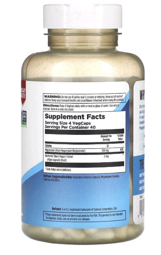 Хелатна форма — магній пов’язаний з гліцином, амінокислотою, що має власні заспокійливі властивості.